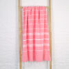 De Ottomania mooi gestreepte hamamdoeken in de kleur candy roze zijn gemaakt van hydrofiel katoen waardoor ze zeer goed vocht opnemen. Deze lichtgewicht hamamdoek is ideaal als strandhanddoek, op reis, op de boot, naar het zwembad, sportschool of de sauna. De doek kan zeer compact worden opgevouwen en weegt maar 250 gram. Bovendien is de hammamdoek snel droog en goed te wassen. Daarom ideaal voor in de koffer, rugzak of strandtas. Prima te gebruiken als strandlaken of op een ligstoel.