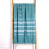 De Ottomania mooi gestreepte hamamdoeken in de kleur petrol zijn gemaakt van hydrofiel katoen waardoor ze zeer goed vocht opnemen. Deze lichtgewicht hamamdoek is ideaal als strandhanddoek, op reis, op de boot, naar het zwembad, sportschool of de sauna. De doek kan zeer compact worden opgevouwen en weegt maar 500 gram. Bovendien is de hammamdoek snel droog en goed te wassen. Daarom ideaal voor in de koffer, rugzak of strandtas. Prima te gebruiken als strandlaken of op een ligstoel.